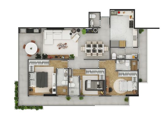 Conta com apartamentos de 2 ou 3 suítes, além de duas coberturas exclusivas com 3 ou 4 suítes.